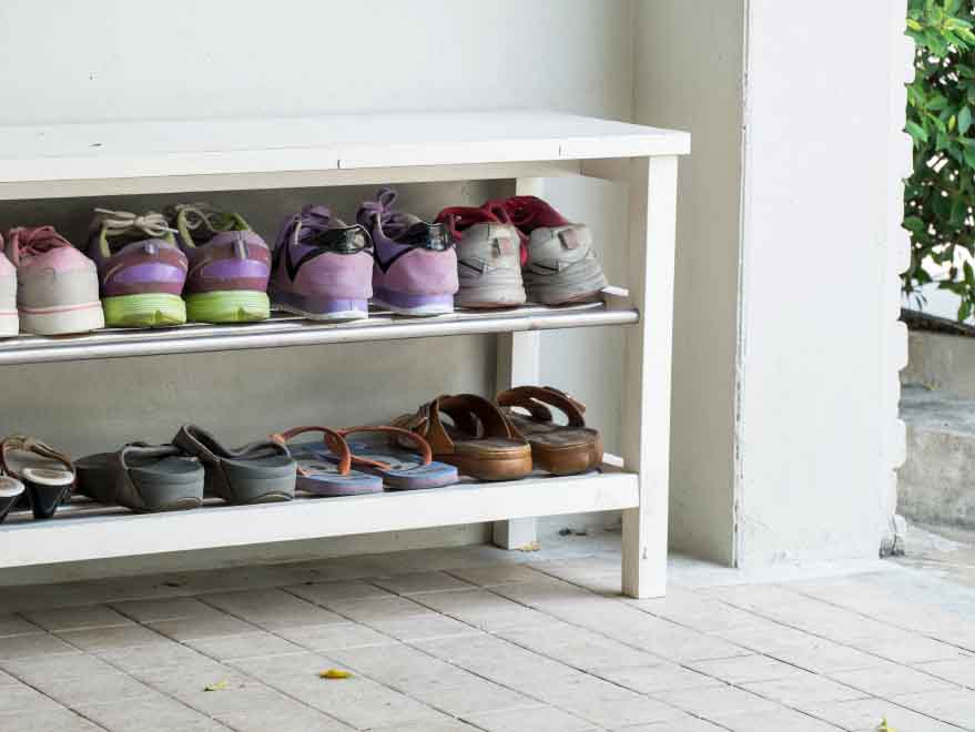 Jika area teras Anda tidak cukup luas untuk menaruh furnitur dan menjadikannya sebagai ruang tamu sederhana, Anda bisa mencoba menjadikannya sebagai tempat penyimpanan sepatu. Anda bisa menggunakan rak sepatu dengan ukuran yang disesuaikan dengan area teras rumah Anda dan tambahkan satu kursi atau bangku yang bisa membuat Anda lebih nyaman ketika bersiap mengenakan sepatu. Sekali lagi, pastikan barang yang Anda simpan di luar ruangan bisa terlindungi secara maksimal oleh furnitur yang Anda gunakan ya.